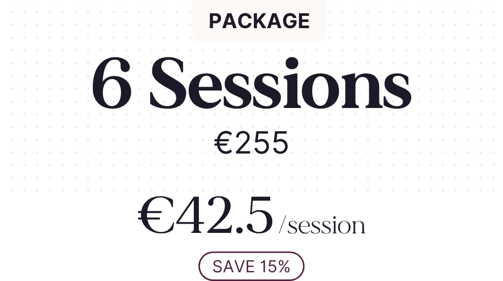 Receive 6 sessions bookable over 6 months and save 15%.