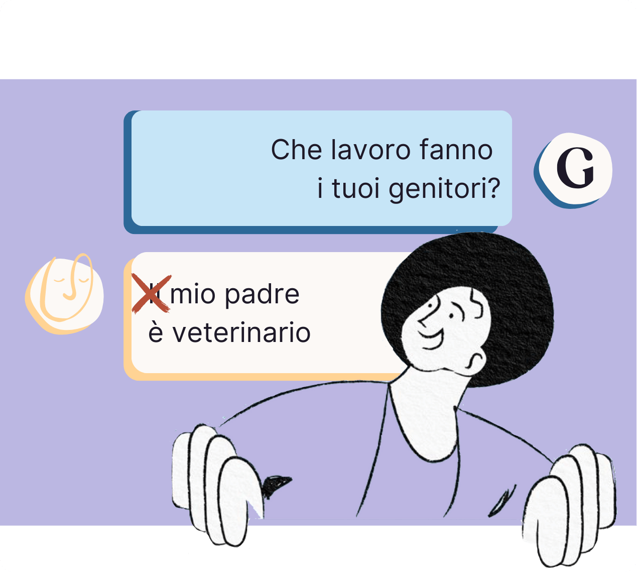 Mio padre si chiama Paolo ed è un veterinario. Mia madre si chiama Margherita ed è un’istruttrice di yoga. Il mio papà e la mia mamma sono due persone energiche e sempre positive. Ho un fratello minore e due sorelle maggiori. Il mio fratellino si chiama Simone e frequenta la scuola elementare. Le mie sorelle maggiori si chiamano Sonia ed Elisa. Sonia è una guida turistica, Elisa è un’organizzatrice di eventi. Sonia è sposata con Giuseppe, mio cognato. Il loro figlio si chiama Michele.