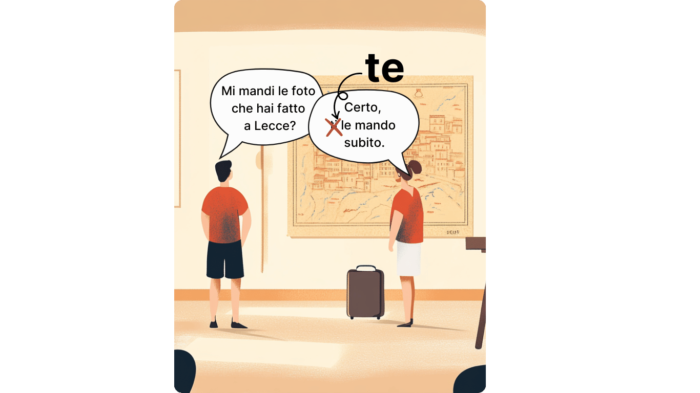 Marina: Che caro! Facciamo così: tu che hai già visto Lecce pensi all’itinerario, io mi occupo di prenotare il treno.