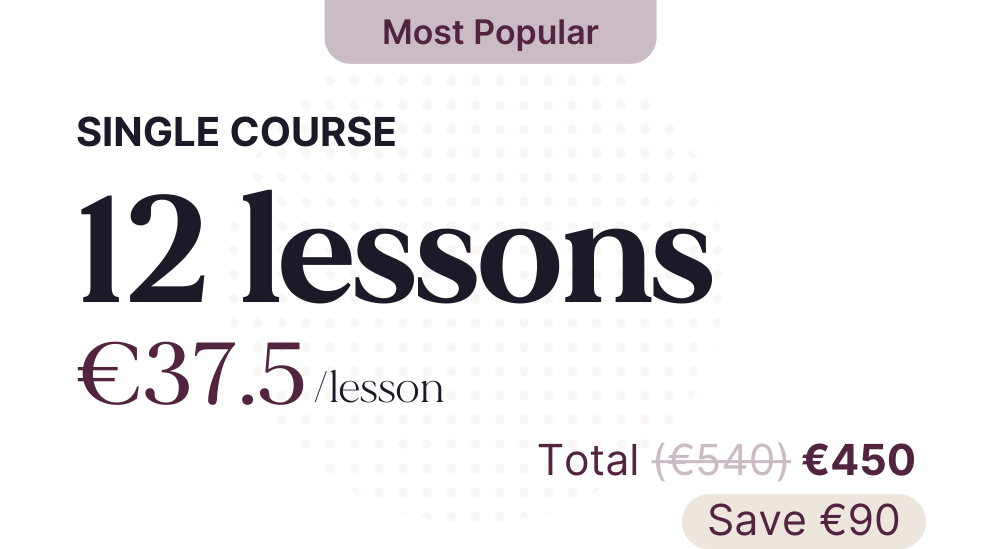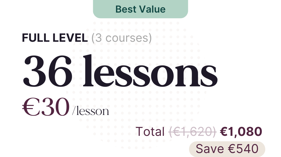 - Private Courses: A1 Beginner, A2 Elementary, and B1 Intermediate—80+ lessons covering grammar, vocabulary, and communication skills.